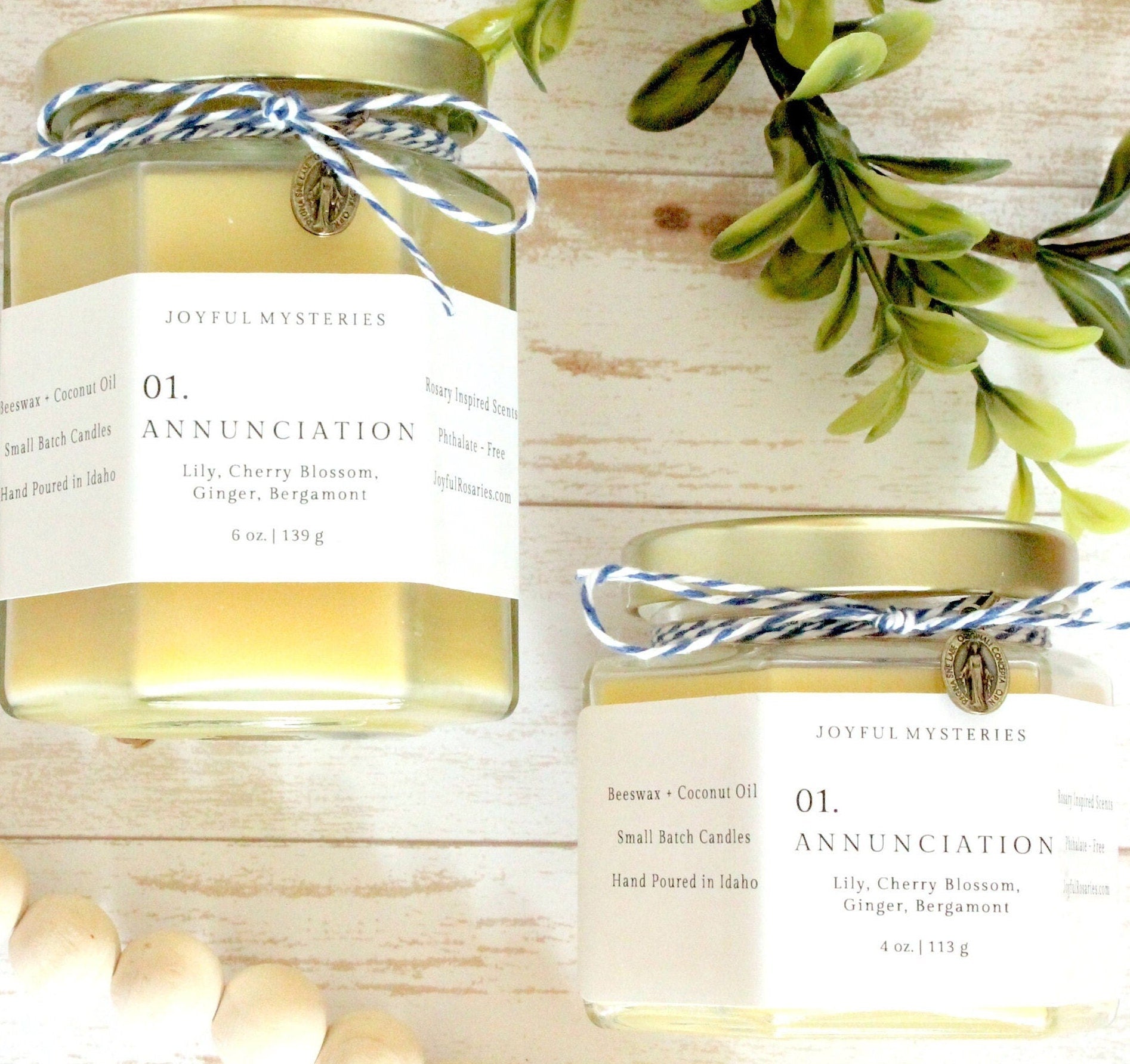 This candle, inspired by the first Joyful Mystery, The Annunciation, is scented with a thoughtful custom blend of fragrance notes including Lily, Cherry Blossom, Ginger and Bergamot. The lily is a traditional symbol of Mary’s purity, which is why I chose this beautiful flower as the forward scent in this candle.