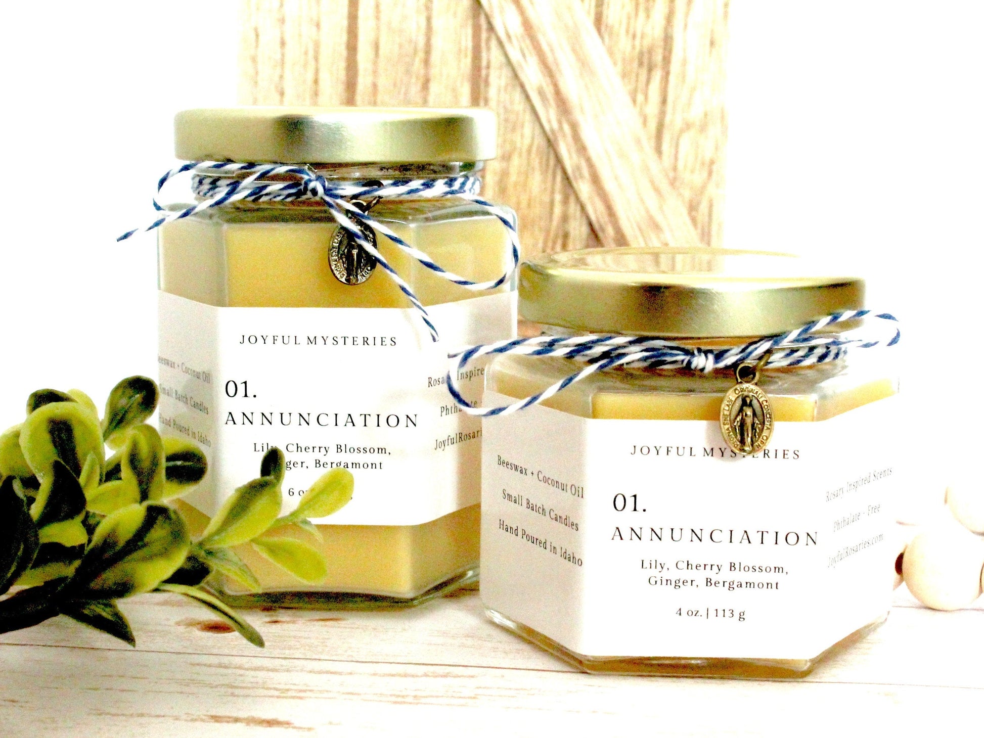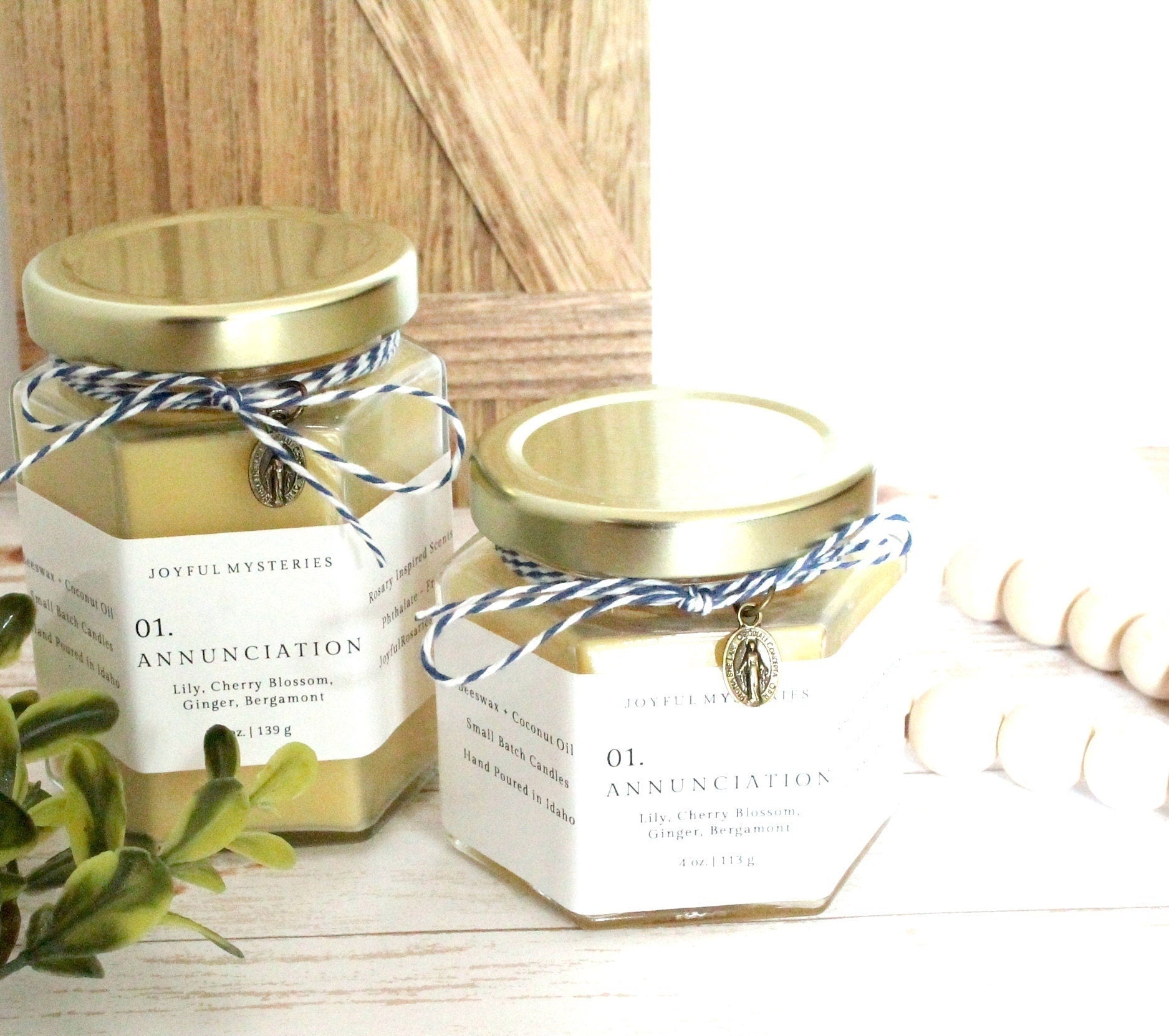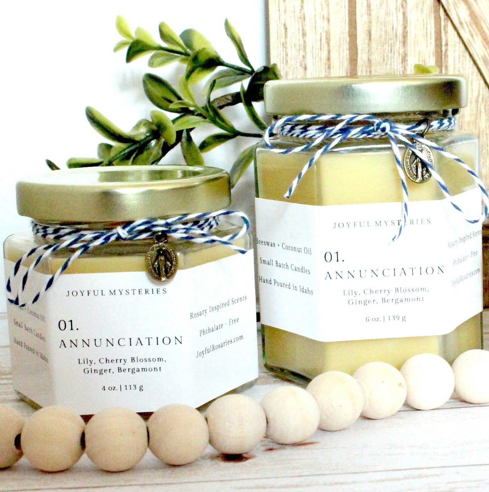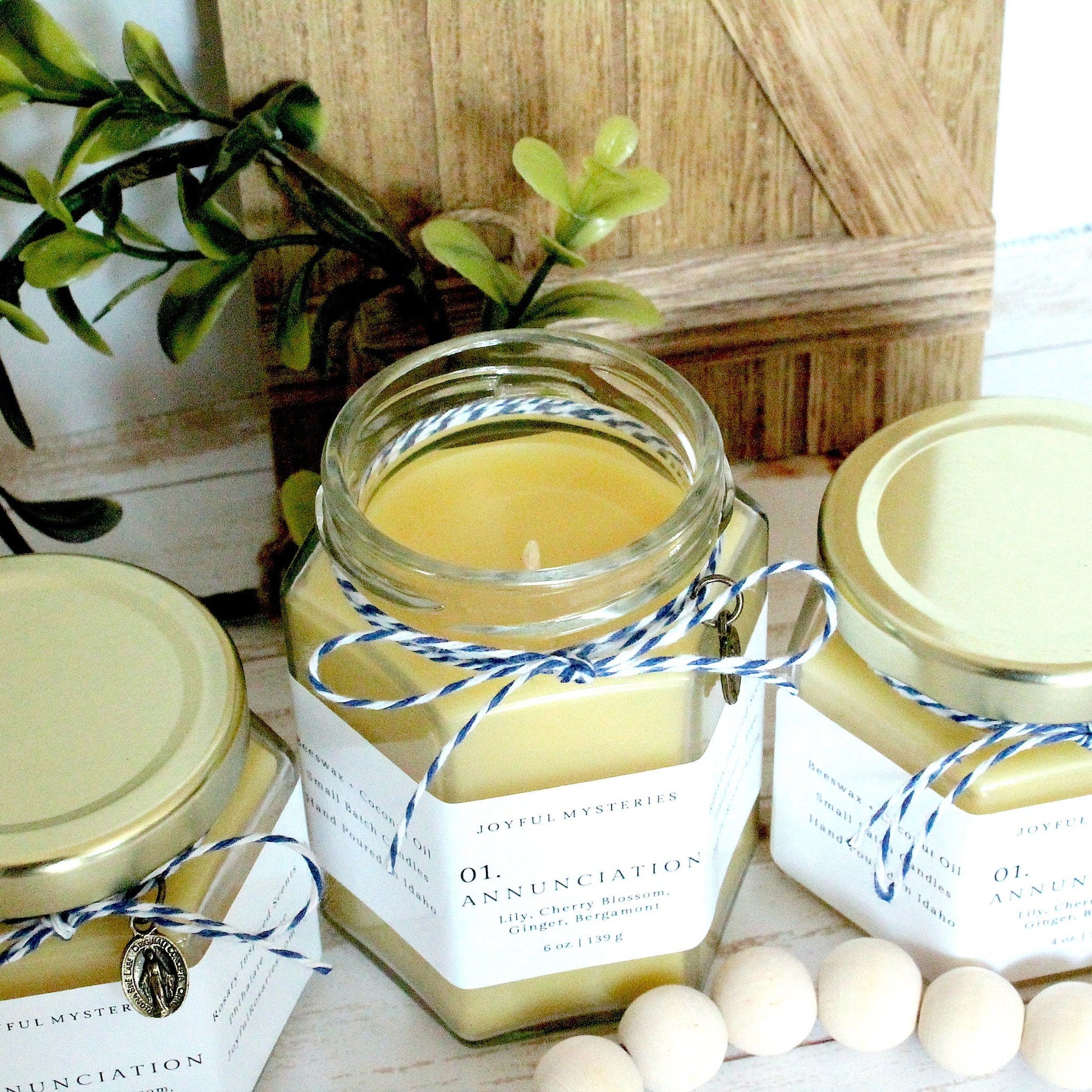 This is a hand poured small batch beeswax candle inspired by the Joyful Mysteries of the Rosary.