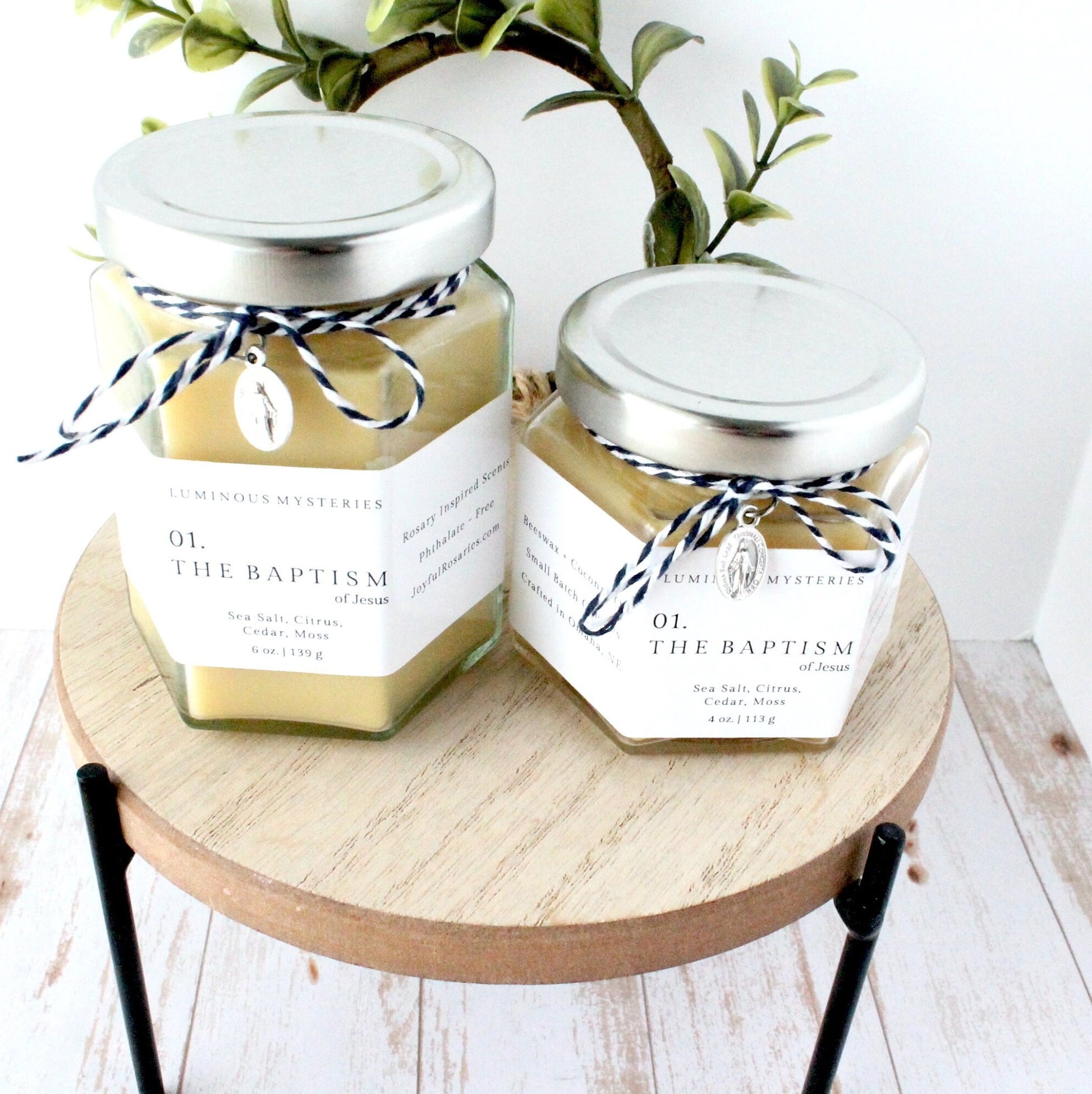 Please note : The pictured "Baptism in the Jordan" Rosary art card is only a prop and not included with your candle. A full set of Rosary art cards can be found at the Little Liturgy Press shop, found here : https://www.etsy.com/shop/LittleLiturgyPress.