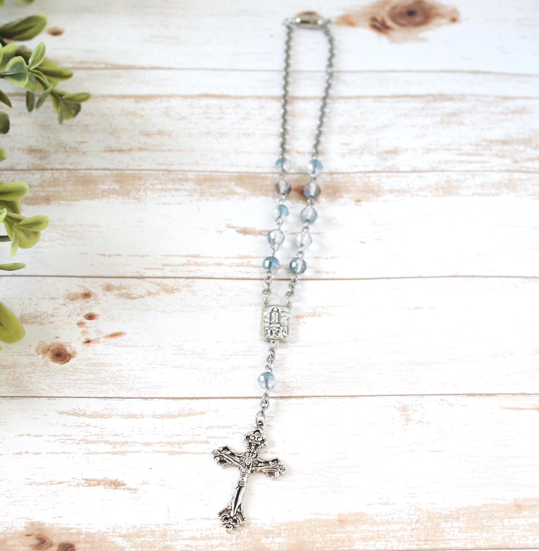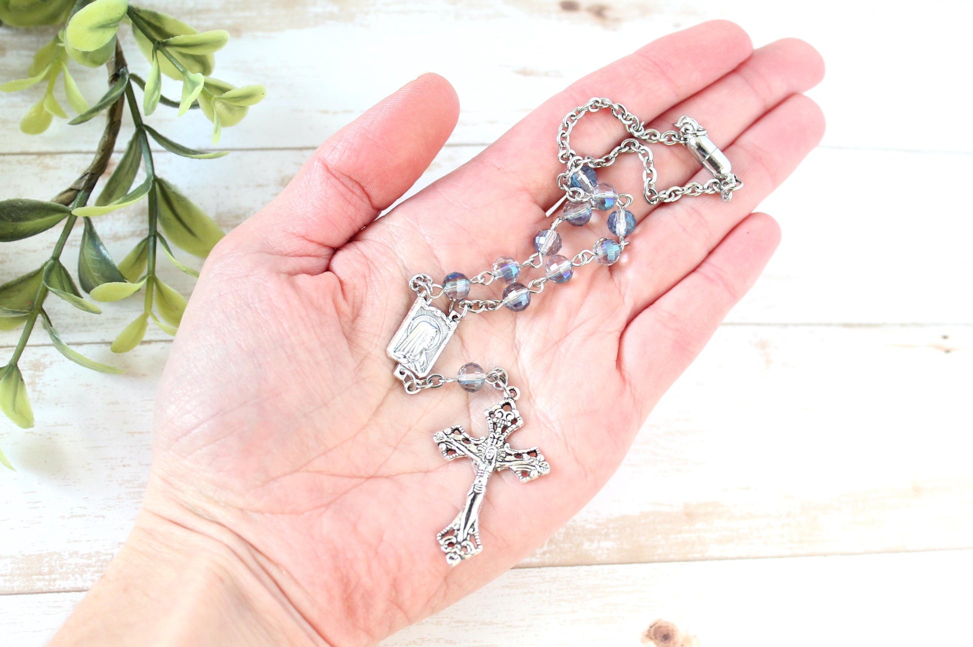 This single decade Rosary is crafted with care- hang it proudly on your rear view mirror in your car with the convenient magnetic closure for easy removal so you can pray at anytime in the car, or while stuck in traffic. Simply grab it and gently tug- no fussing necessary while you are behind the wheel!