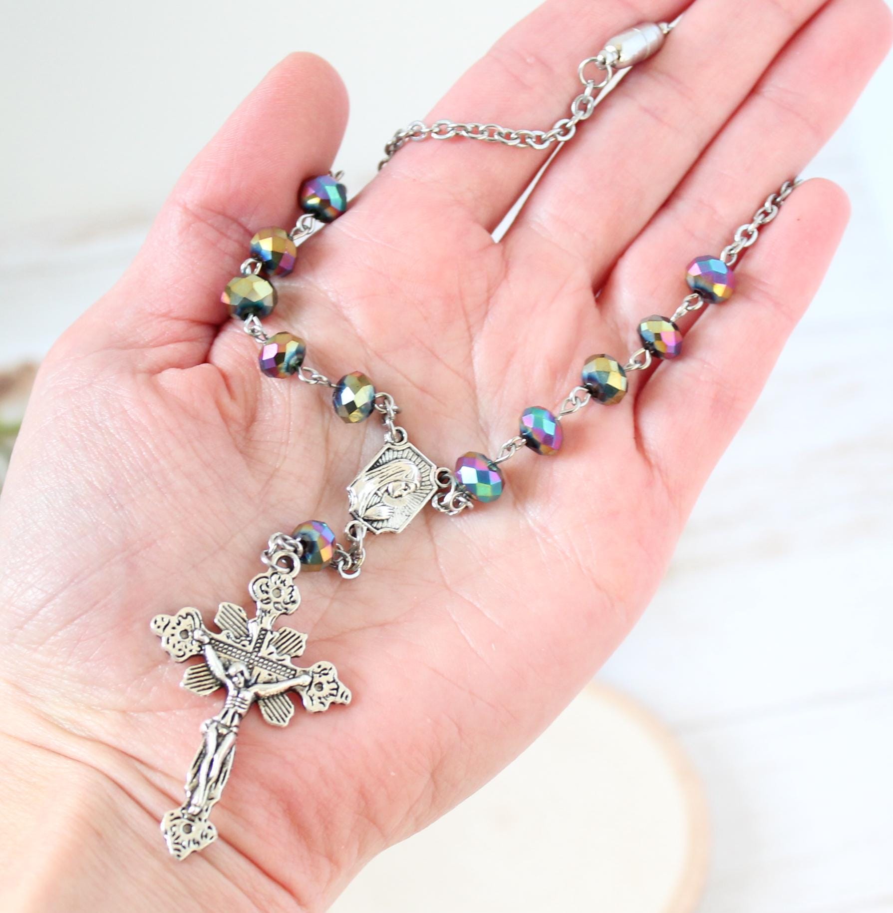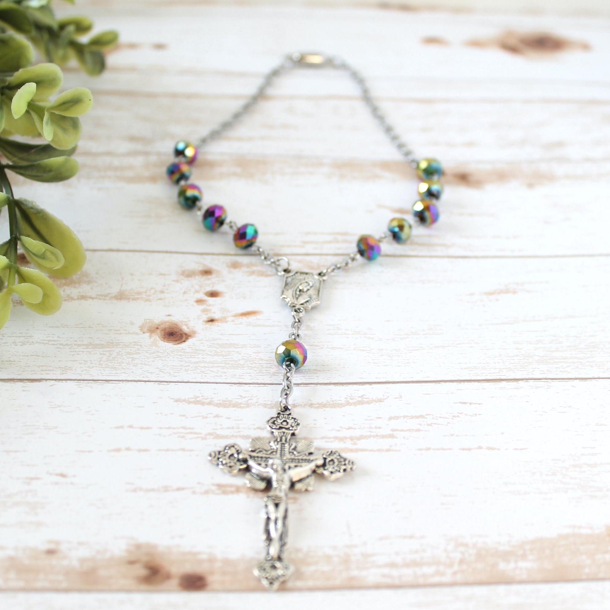 This single decade Rosary is crafted with care- hang it proudly on your rear view mirror in your car with the convenient magnetic closure for easy removal so you can pray at anytime in the car, or while stuck in traffic. Simply grab it and gently tug- no fussing necessary while you are behind the wheel!