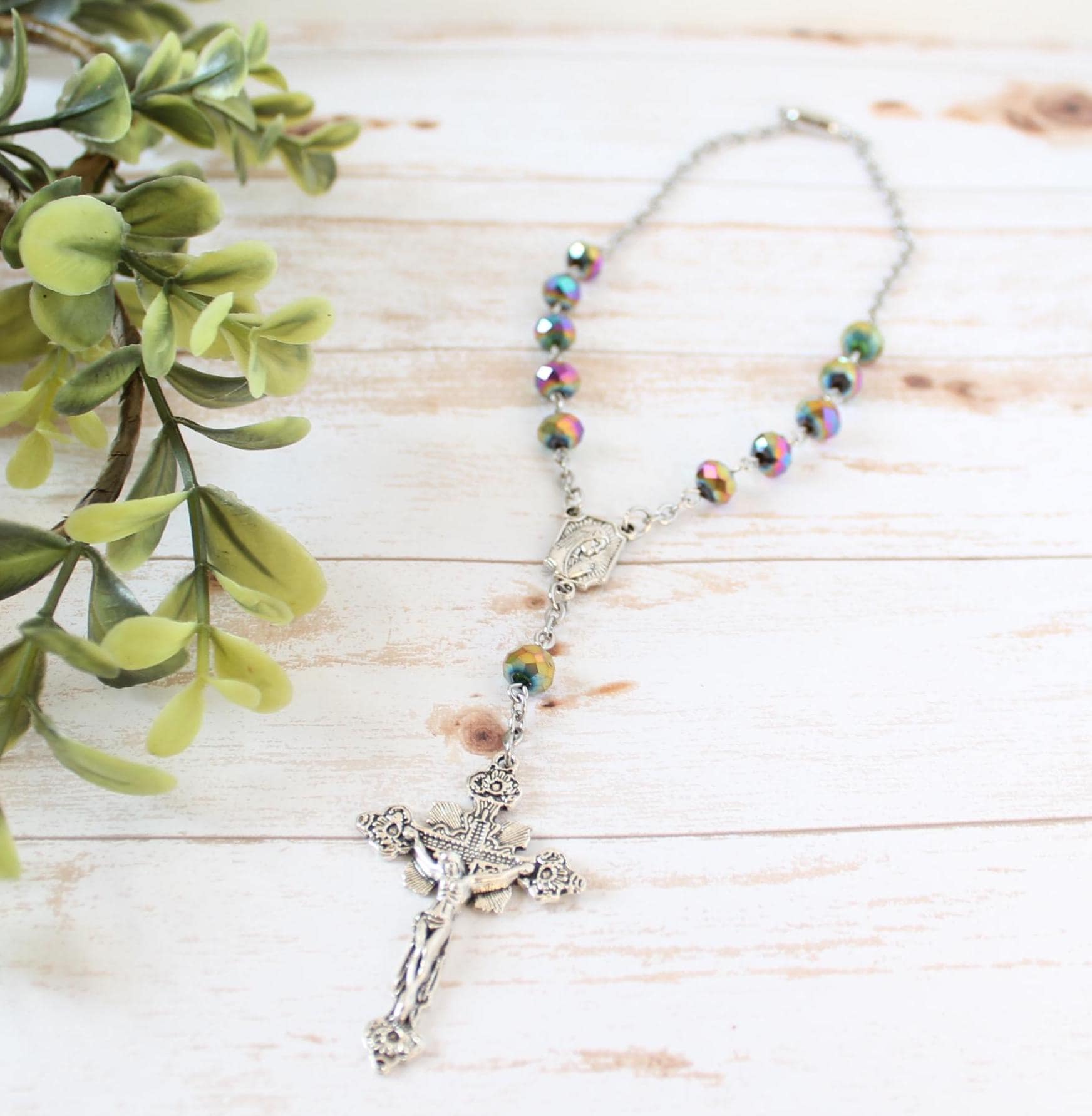 This car Rosary has been crafted with strong stainless steel chain and wire, so your Rosary will be your companion on the road for years to come. It is designed to hang just below your mirror, so no beads will be hidden behind.