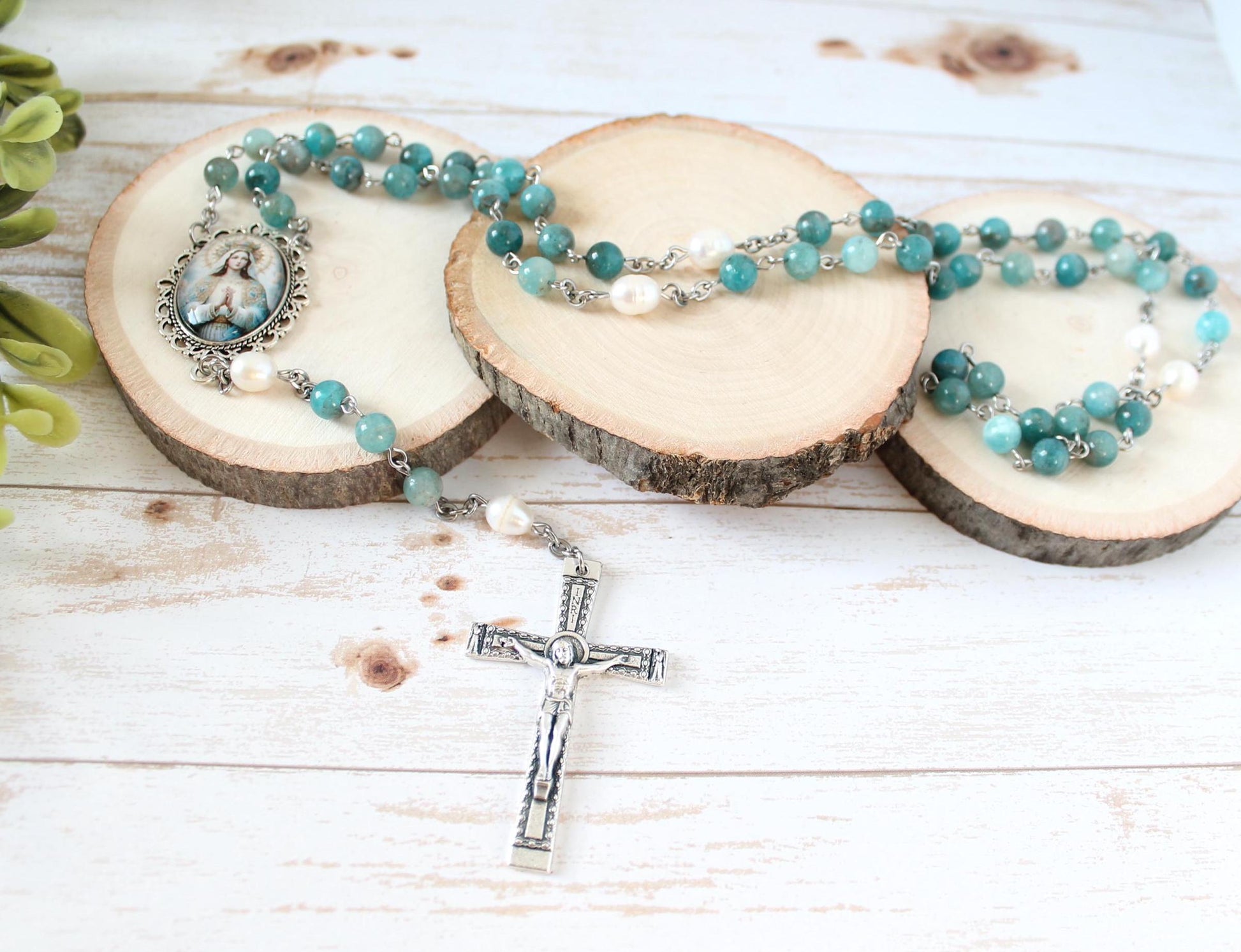 The Hail Mary beads used in this Rosary are beautiful 6mm size apatite gemstone beads. The 6 Our Fathers are a 7-8mm freshwater pearl oval rice shaped beads.