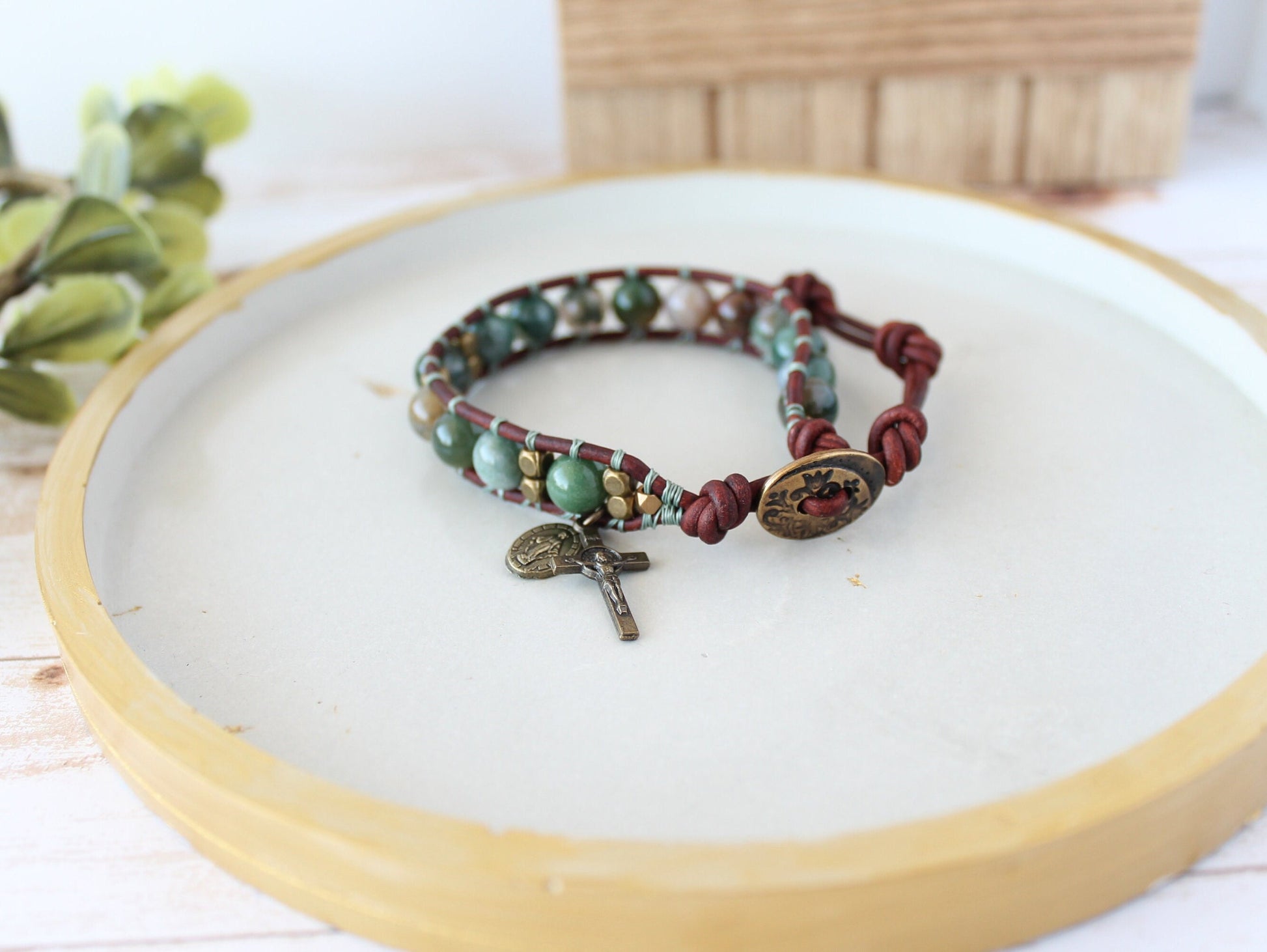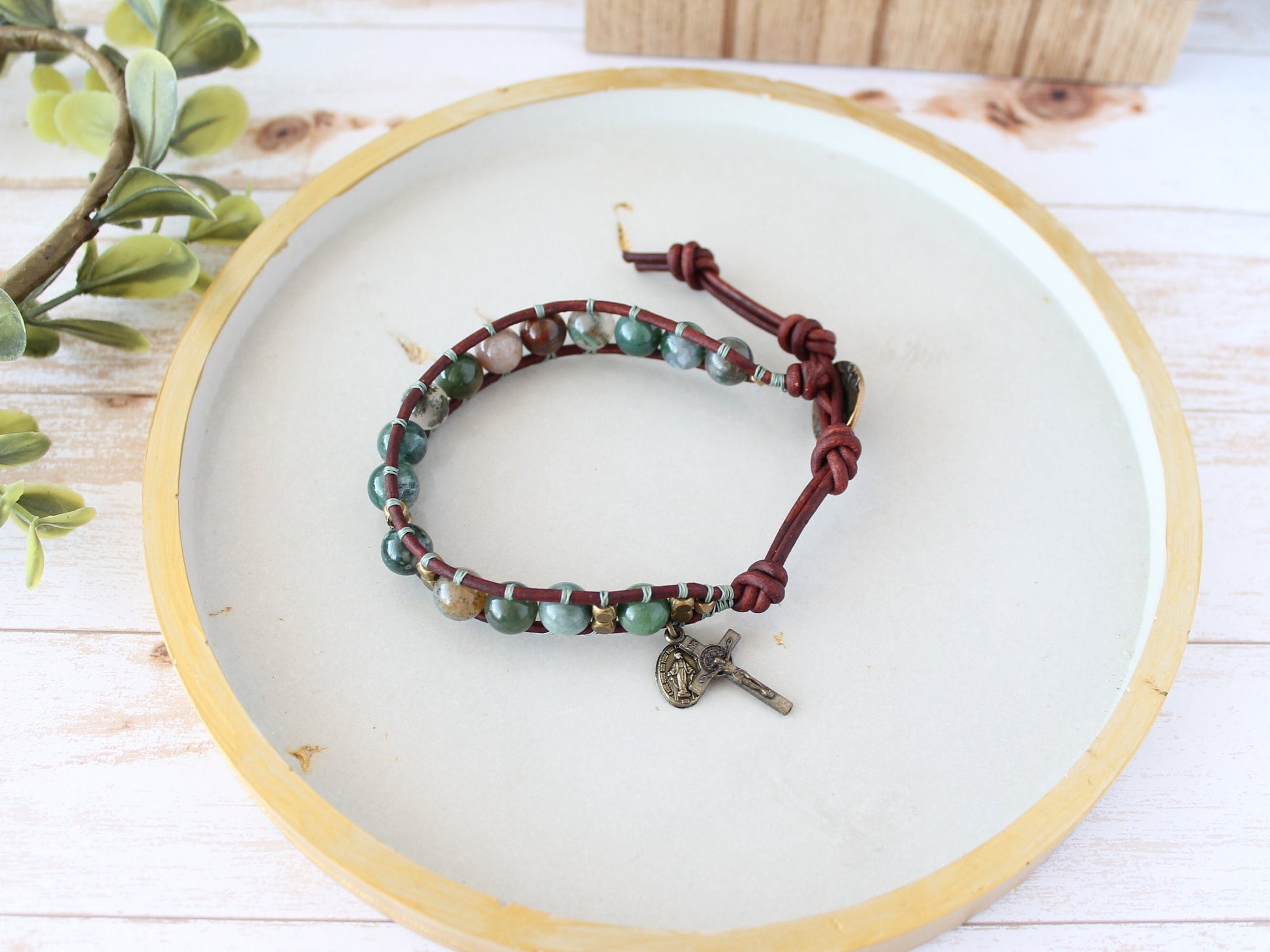 This Rosary bracelet is adjustable, and includes 3 knotted leather closure loops- this allows you to choose which fit you like best. Once you have your correct fit, the remaining leather loops (if any) may then be easily snipped with a pair of scissors.