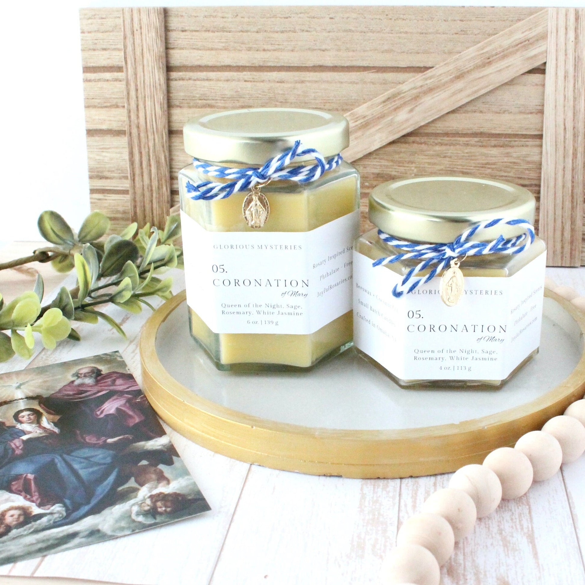 This is a hand poured small batch beeswax candle inspired by the Glorious Mysteries of the Rosary. This candle, inspired by the fifth Glorious Mystery, The Coronation of Mary, is scented with a thoughtful custom blend of fragrance notes including White Jasmine, Rosemary, Sage, and Queen of the Night.