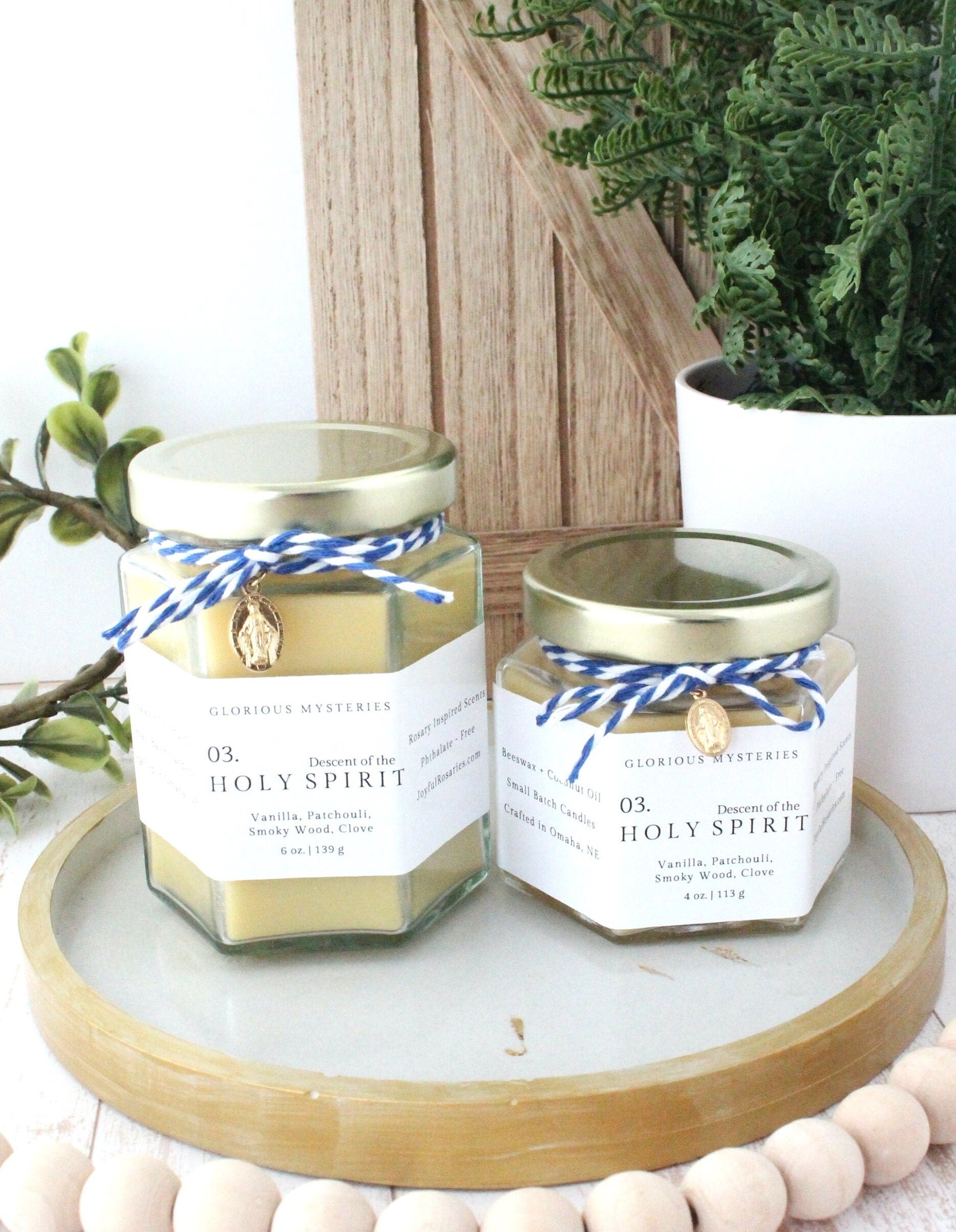 This is a hand poured small batch beeswax candle inspired by the Glorious Mysteries of the Rosary. This candle, inspired by the third Glorious Mystery, The Descent of the Holy Spirit, is scented with a thoughtful custom blend of fragrance notes including Vanilla, Patchouli, Smoky Wood and Clove.