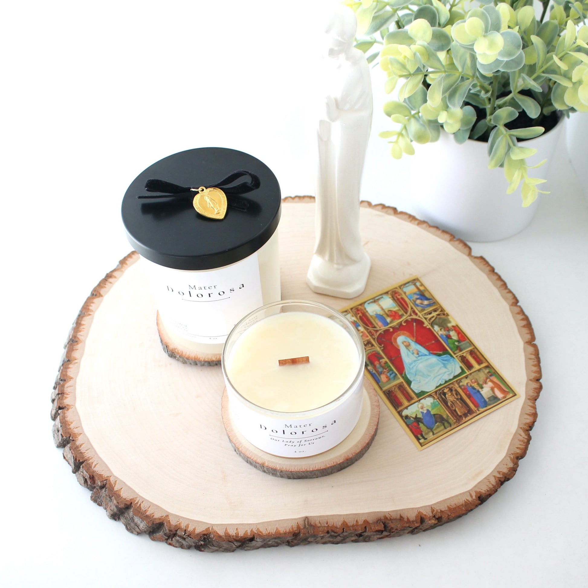 All 8 oz "Immaculate Collection" candles will include its own muslin bag, both sizes will receive a corresponding "Sorrows of Mary" holy card; perfect for gift giving!