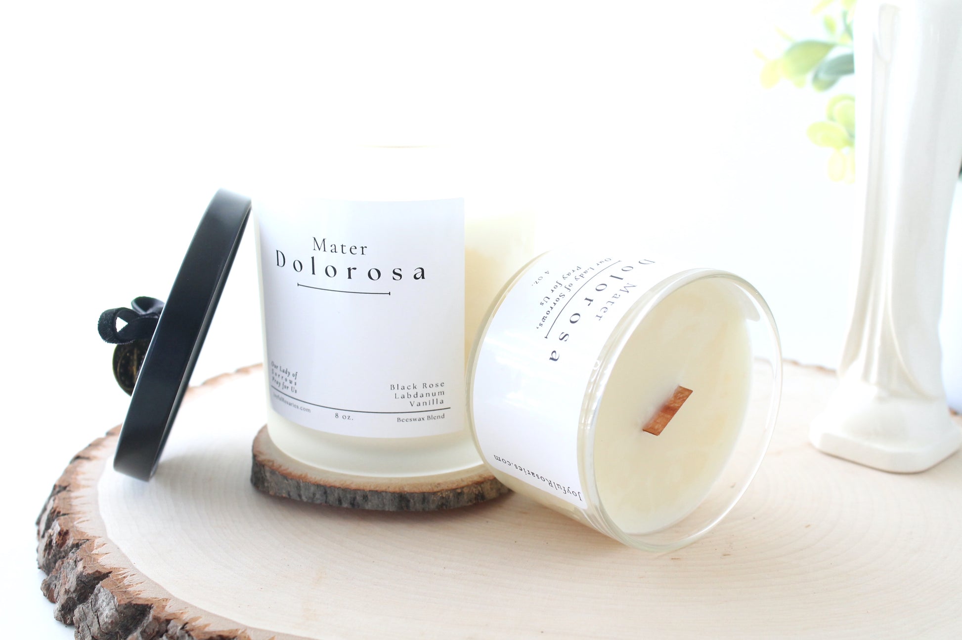 These scents are intentionally chosen as a gentle reminder of our Sorrowful Mother and the suffering she endured. Black Rose symbolizes death and mourning, Labdanum, which is thought to have been used in various anointing oils and temple incense as offerings to God, and Vanilla to remind us of Mary's sweetness.