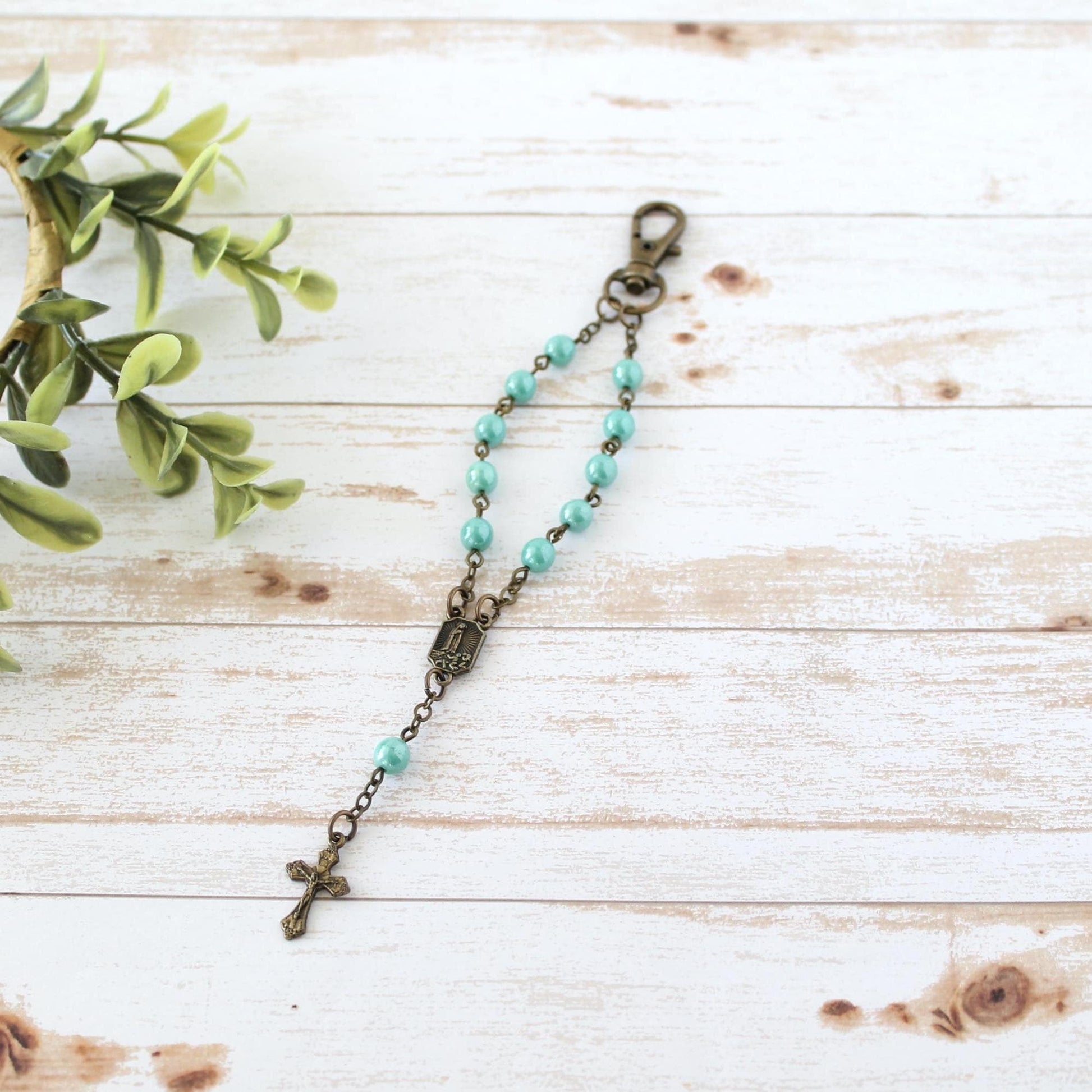 Teal Glass Bead Rosary Keychain