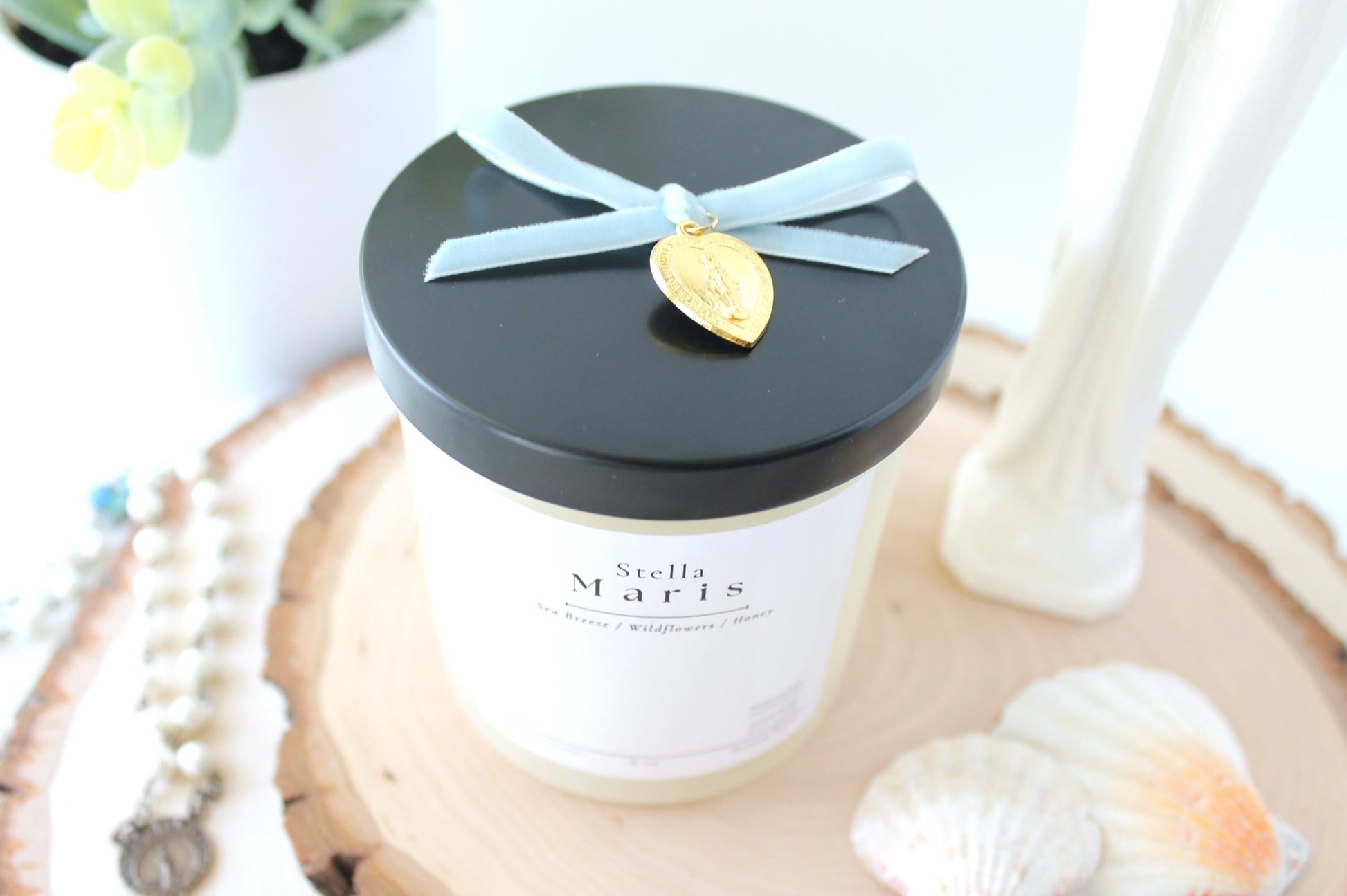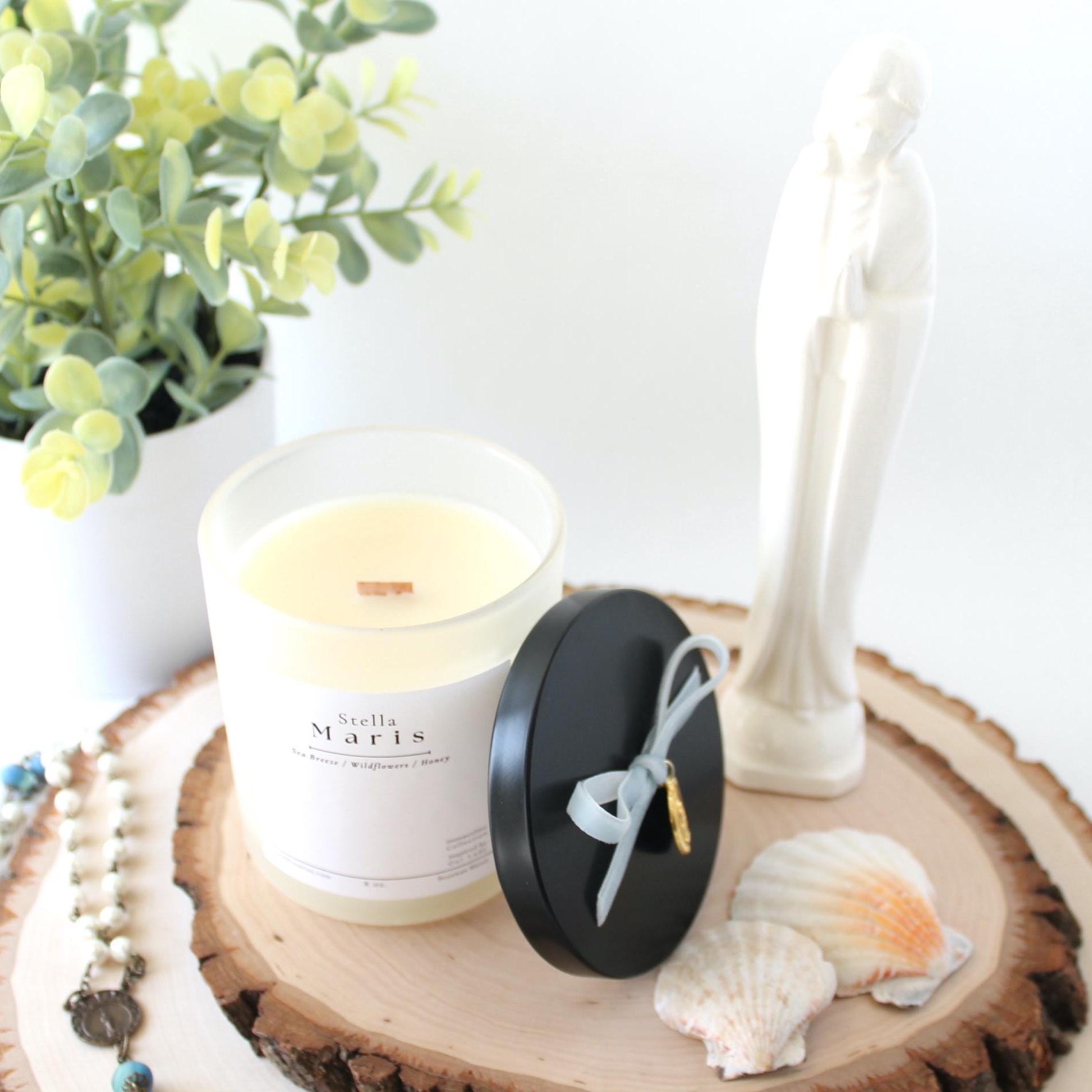 Fill your sacred living space with the salty aroma of sea breeze, joined with the fragrance of honey and wildflowers blowing by the ocean shore. These scents are intentionally chosen as a reminder of Our Lady, Star of the Sea - always there to guide us through the storms. Light this candle to honor our Blessed Mother.