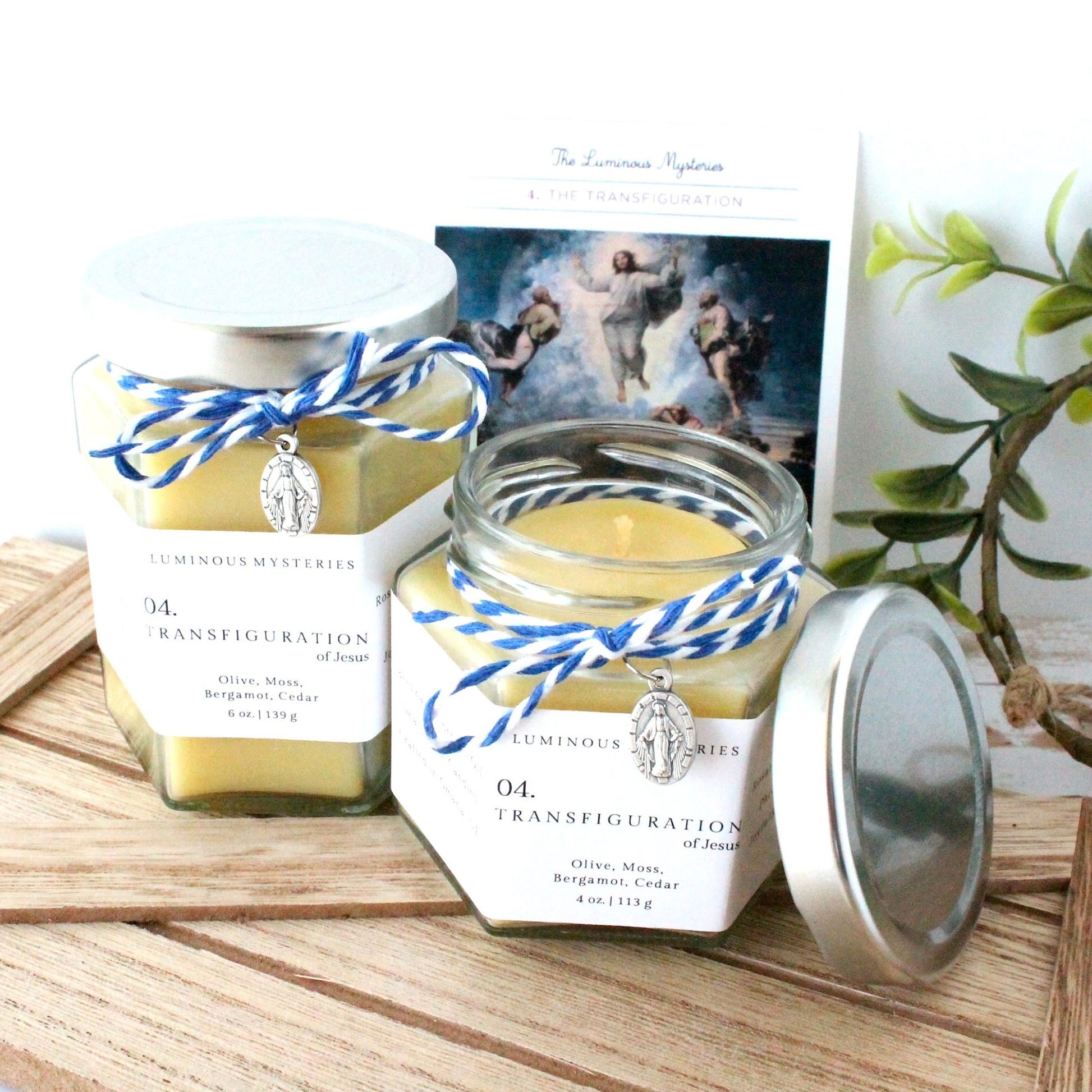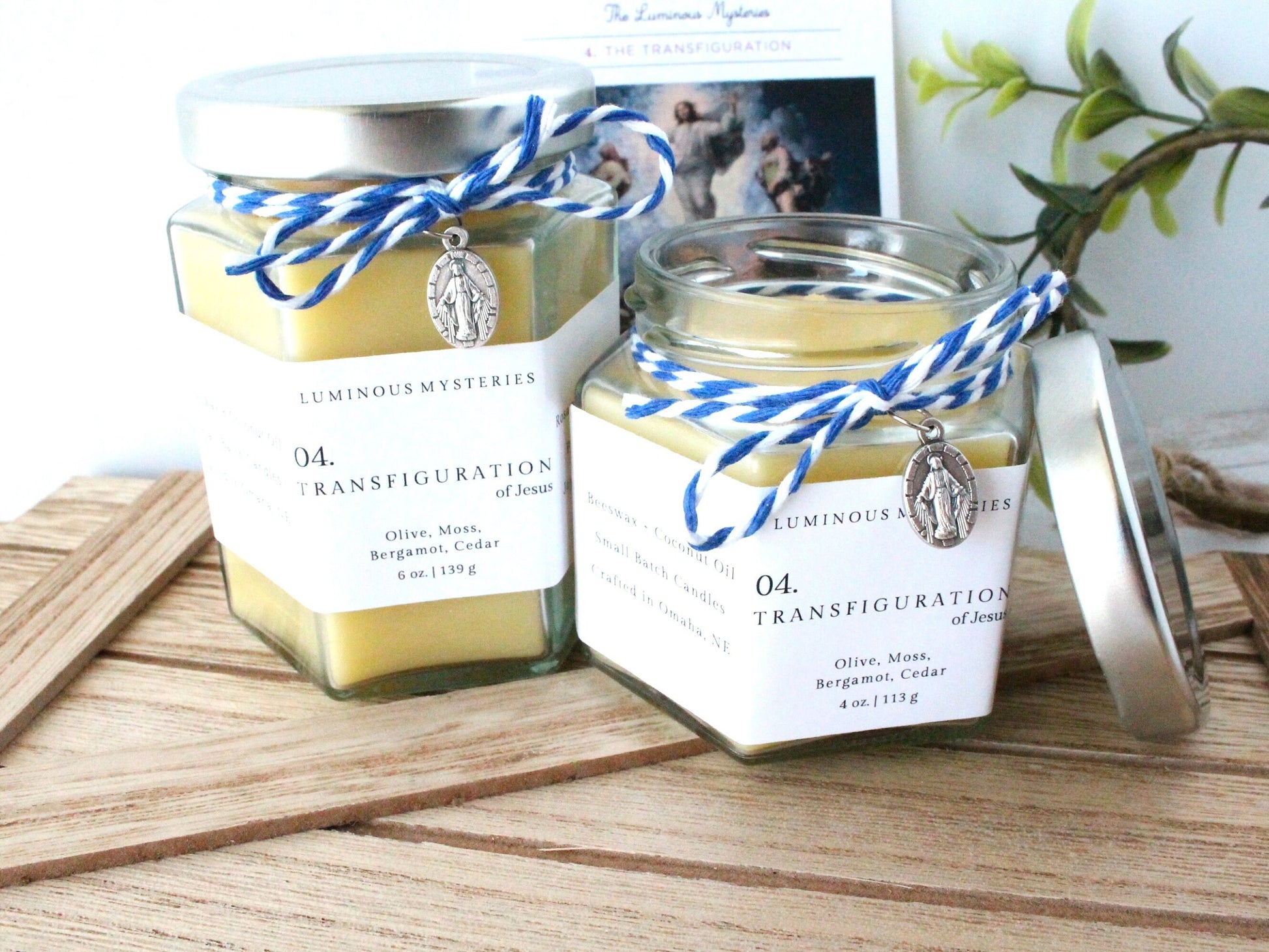 This is a hand poured small batch beeswax candle inspired by the Luminous Mysteries of the Rosary. This candle, inspired by fourth mystery- The Transfiguration of Jesus, is scented with a thoughtful custom blend of fragrance notes including Olive, Moss, Bergamot, and Cedar.
