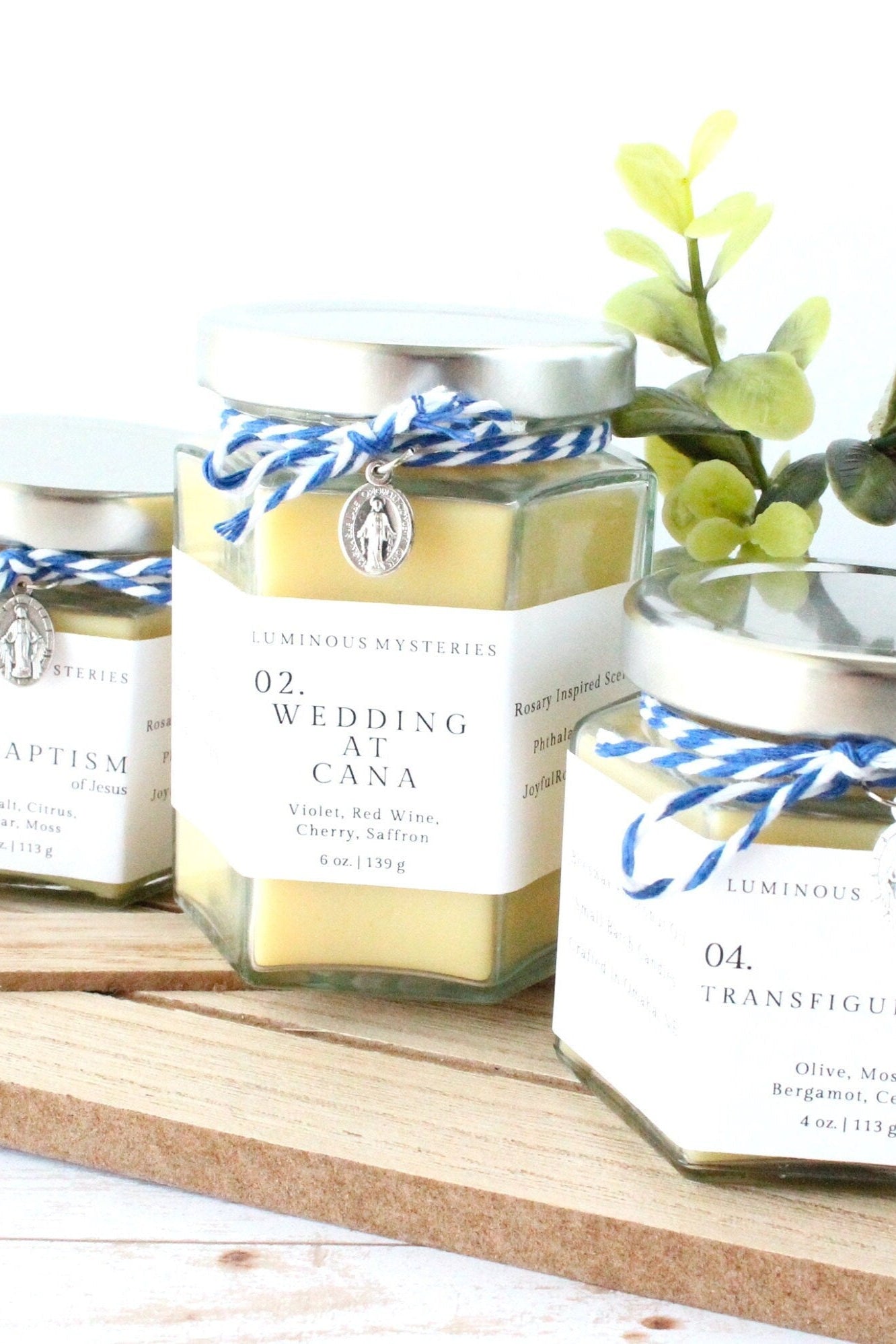 All materials and fragrances I use are 100% clean, non-toxic, and centered around the Catholic faith.