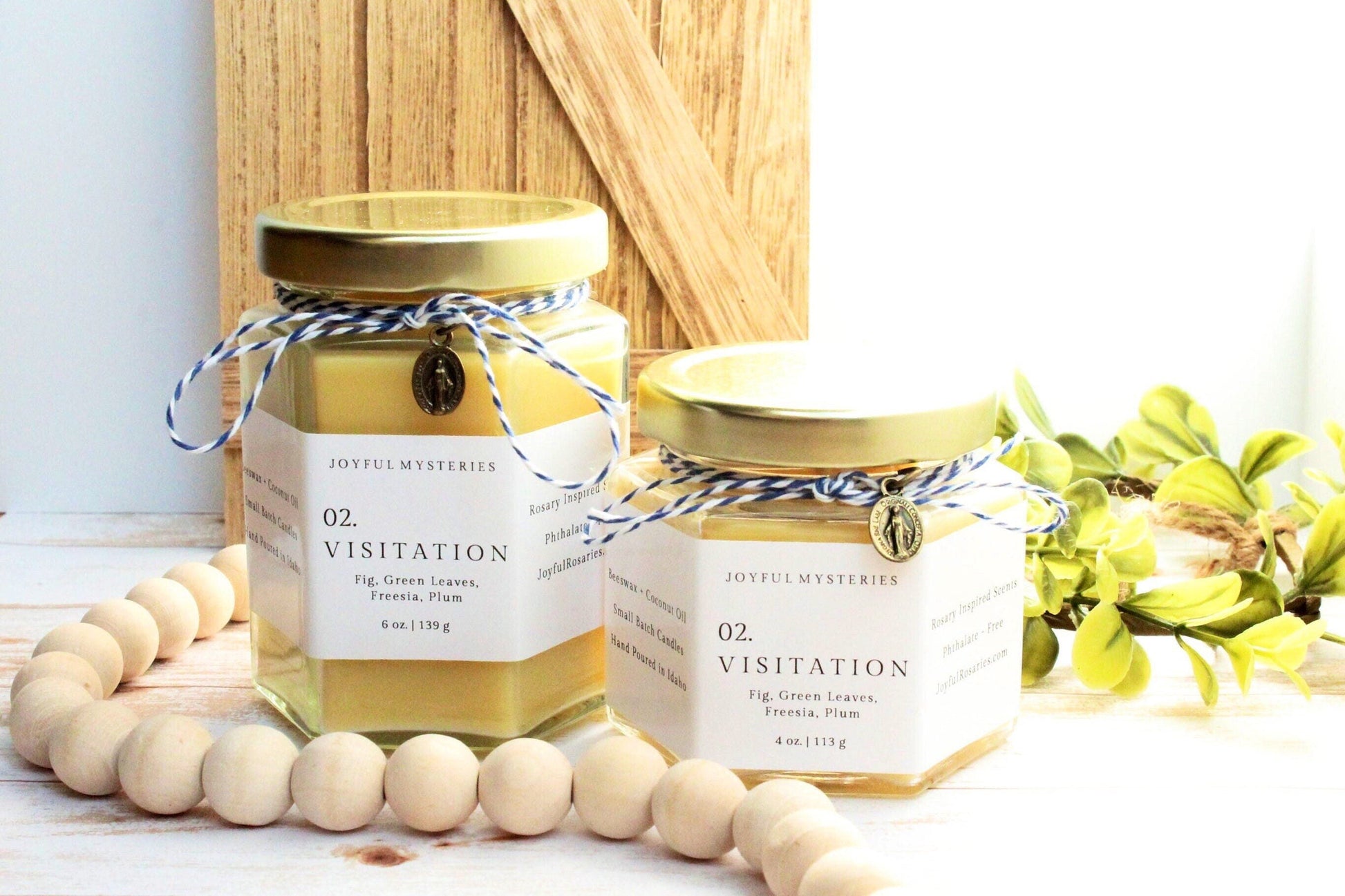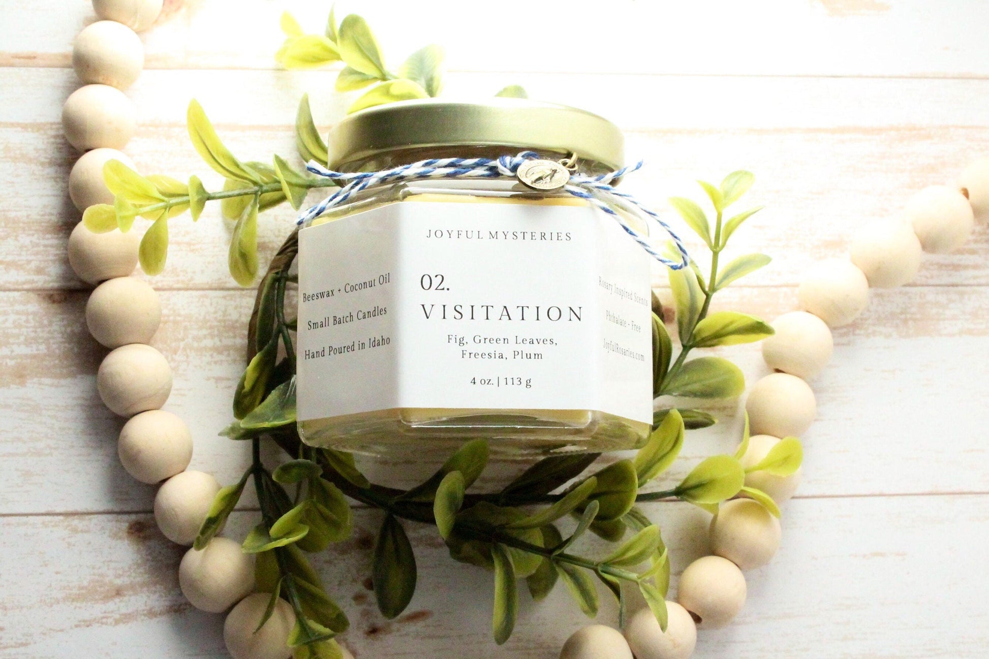 This is a hand poured small batch beeswax candle inspired by the Joyful Mysteries of the Rosary. This candle, inspired by the second Joyful Mystery, The Visitation, is scented with a thoughtful custom blend of fragrance notes including Fig, Green Leaves, Freesia, and Plum.